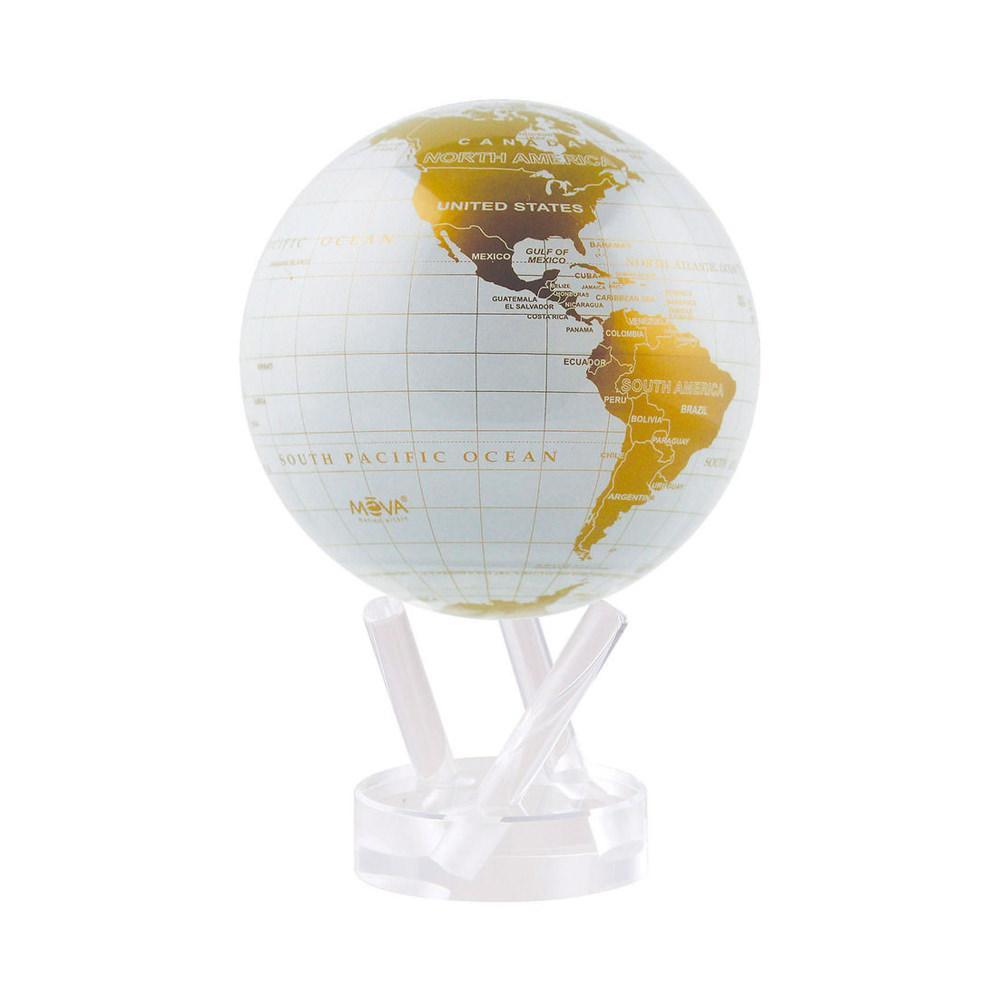 The White and Gold MOVA Globe features a crisp white ocean canvas that is decorated with clean lines, pencil-sharp details, and slick gold continents that glimmer in the light.
